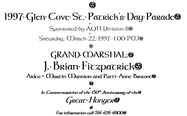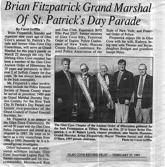 Our thanks to Grand Marshal J. Brian Fitzpatrick, and his Aides Martin Mannion and Patti Ann Browne for leading the parade, and our thanks to Division 8 AOH for another successful event. On behalf of myself, the City Council, and all the citizens of Glen Cove, we salute this beautiful country and their extraordinary people.